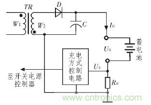為了提高開關(guān)電源工作的可靠性,防止輸出電流過(guò)流等情況發(fā)生,許多開關(guān)電源在輸出端接入電流傳感器,檢測(cè)輸出電流的大小,一旦輸出電流超過(guò)設(shè)計(jì)標(biāo)準(zhǔn),保護(hù)電路即采取必要措施保護(hù)開關(guān)電源的安全[3]。此外,當(dāng)開關(guān)電源作為蓄電池充電器時(shí),也需要檢測(cè)輸出電流的大小,以此了解蓄電池的充電情況,適時(shí)切換充電方式,達(dá)到提高充電效率,延長(zhǎng)蓄電池的使用壽命的效果。圖3 為一個(gè)蓄電池充電器的輸出電流檢測(cè)原理圖, 電流檢測(cè)電阻RS將蓄電池的充電電流轉(zhuǎn)化為電壓US,反饋給充電方式控制電路,由控制電路根據(jù)充電電流的大小適時(shí)切換充電方式[4]。