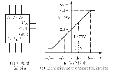 常用的TBC-DS 系列閉環(huán)霍爾電流傳感器的引線框圖和傳輸特性如圖5 所示[6]。圖5(a)所示的霍爾電流傳感器引線中,I+1~3和I-1~3是被測(cè)電流的串入繞組引腳, 其中,I+1和I-1是一個(gè)被測(cè)電流繞組的引腳,I+2和I-2、I+3和I-3也分別各是一個(gè)被測(cè)電流繞組的引腳。當(dāng)3 個(gè)被測(cè)電流繞組并聯(lián)時(shí),霍爾電流傳感器的額定測(cè)量電流為IPN1; 若將兩個(gè)繞組并聯(lián)再與一個(gè)繞組串聯(lián)時(shí),霍爾電流傳感器的額定測(cè)量電流為IPN2;若將3 個(gè)繞組相互串聯(lián)時(shí),霍爾電流傳感器的額定測(cè)量電流為IPN3。3 個(gè)額定測(cè)量電流間的關(guān)系為:IPN1=2 IPN2=3 IPN3。可見(jiàn),通過(guò)3 組被測(cè)電流繞組的不同接法,可以改變霍爾電流傳感器的額定測(cè)量電流值,擴(kuò)展測(cè)量區(qū)間。VCC為電源引腳,電源電壓通常為5 V;GND 是電源和傳感器輸出電壓的地;OUT 是傳感器電壓輸出引腳。由5(b)所示的霍爾電流傳感器傳輸特性可見(jiàn),當(dāng)被測(cè)電流為0 時(shí),其輸出電壓UOUT =2.5 V;當(dāng)被測(cè)電流不為0 且方向?yàn)閺腎+至I-時(shí),輸出電壓UOUT>2.5 V,當(dāng)被測(cè)電流不為0 且方向?yàn)閺腎-至I+時(shí),輸出電壓UOUT<2.5 V。IPN和-IPN是霍爾傳感器的正負(fù)額定電流, 當(dāng)被檢測(cè)電流達(dá)到額定電流時(shí),根據(jù)電流方向的不同,輸出電壓UOUT 的值分別為3.125 V 或1.875 V, 即相對(duì)于2.5 V 的中心值有±0.625 V的偏移。當(dāng)被檢測(cè)電流值絕對(duì)值大于IPN 時(shí),霍爾傳感器仍可輸出與被檢測(cè)電流成線性關(guān)系的電壓值,直至被檢測(cè)電流達(dá)到霍爾傳感器的最大檢測(cè)電流IPmax。通常,IPmax>3 IPN。