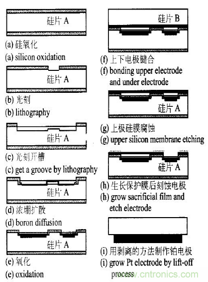 硅電容式壓力傳感器的敏感元件是半導(dǎo)體薄膜,它可以由單晶硅、多晶硅等利用半導(dǎo)體工藝制作而成。典型的電容式傳感器由上下電極、絕緣體和襯底構(gòu)成。當(dāng)薄膜受壓力作用時(shí),薄膜會(huì)發(fā)生一定的變形,因此,上下電極之間的距離發(fā)生一定的變化,從而使電容發(fā)生變化。但電容式壓力傳感器的電容與上下電極之間的距離的關(guān)系是非線性關(guān)系,因此,要用具有補(bǔ)償功能的測(cè)量電路對(duì)輸出電容進(jìn)行非線性補(bǔ)償。由于高溫壓力傳感器工作在高溫環(huán)境下,補(bǔ)償電路會(huì)受到環(huán)境溫度的影響,從而產(chǎn)生較大的誤差。基于模型識(shí)別的高溫壓力傳感器,正是為了避免補(bǔ)償電路在高溫環(huán)境下工作產(chǎn)生較大誤差而設(shè)計(jì)的,其設(shè)計(jì)方案是把傳感器件與放大電路分離,通過(guò)模型識(shí)別來(lái)得到所測(cè)環(huán)境的壓力。高溫工作區(qū)溫度可達(dá)350 ℃。傳感器件由鉑電阻和電容式壓力傳感器構(gòu)成。其MEMS 工藝如下: