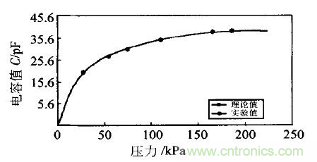 表1 可見(jiàn),擬合的電容誤差小于1 %。由此可見(jiàn),在不同的時(shí)刻測(cè)得UO ( t) ,通過(guò)曲線擬合得出參數(shù)RC。再給電路加小信號(hào)直流電源,測(cè)出R 值,即求得C ,通過(guò)C 值則可知被測(cè)環(huán)境的壓力。圖5為350 ℃時(shí),不同的壓力對(duì)應(yīng)的電容的理論值和實(shí)驗(yàn)值,從實(shí)驗(yàn)數(shù)據(jù)(表2) 可得,在測(cè)壓的過(guò)程中,利用模型識(shí)別的方法,誤差較小,其測(cè)壓誤差小于2 %。