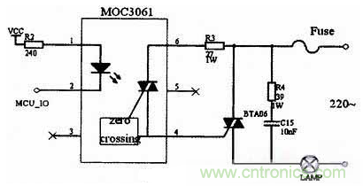 本系統(tǒng)由光電傳感器檢測(cè)洗手間內(nèi)是否有人,單片機(jī)進(jìn)行計(jì)數(shù),當(dāng)N不為零時(shí),單片機(jī)會(huì)向與MOC3061芯片引腳相連的端口輸送信號(hào),然后通過(guò)可控硅來(lái)控制燈的開(kāi)、關(guān)。其中R3是雙向可控硅的門極電阻,當(dāng)可控硅靈敏度較高時(shí),門極阻抗也很高,并上R3可提高抗干擾能力。 39Ω電阻和0.01μF電容組成浪涌吸收電路,防止浪涌電壓損壞雙向可控硅。其電路圖如圖4所示。
