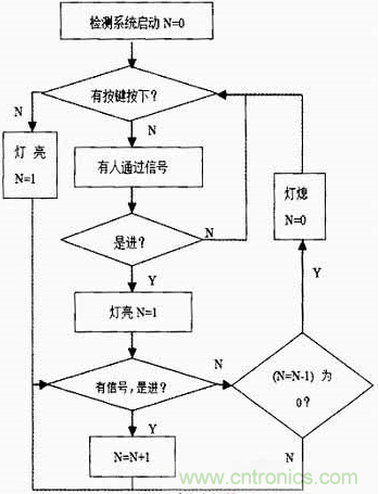 系統(tǒng)流程圖如圖5所示。其中N表示洗手間內(nèi)現(xiàn)有的人數(shù),當(dāng)檢測(cè)系統(tǒng)電源連上后,光電傳感器開(kāi)始檢測(cè),但系統(tǒng)不知道洗手間內(nèi)此時(shí)是否有人,默認(rèn)是無(wú)人,因而燈是不會(huì)亮的,這時(shí)按鍵可以用來(lái)對(duì)系統(tǒng)進(jìn)行調(diào)整。當(dāng)光強(qiáng)增大到一定值時(shí),檢測(cè)系統(tǒng)自動(dòng)停止工作。