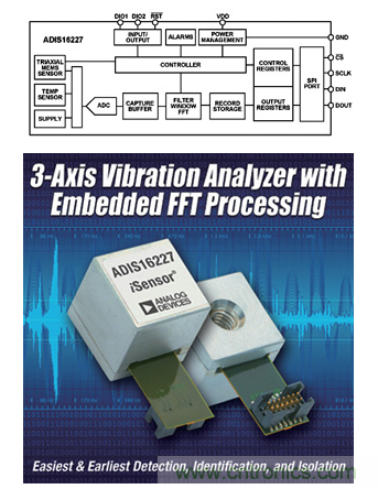 在一些應(yīng)用案例中,相對簡單的傳感器輸出可能就足夠了,但在另一些應(yīng)用中(例如,通過震動分析進(jìn)行狀態(tài)監(jiān)控),則需要增加相當(dāng)多的處理過程才能實現(xiàn)所需的輸出。圍繞慣性傳感器而構(gòu)建的一個高集成度器件示例是ADIS16227(見圖2),它是一款完全自治的頻域震動監(jiān)控器。此類器件可能不提供相對簡單的g/mV輸出,而是提供特定應(yīng)用分析。在本例中,其嵌入式頻域處理、512點實值FFT和片上存儲器能夠識別各震動源并進(jìn)行歸類,監(jiān)控其隨時間的變化情況,并根據(jù)可編程的閾值做出反應(yīng)。