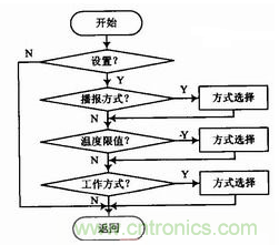 可設(shè)置的參數(shù)主要有,播報(bào)方式:“連續(xù)、隔x秒、禁止”;報(bào)警溫度值;工作方式等。在需要實(shí)時關(guān)注溫度值的時候,可以設(shè)置為連續(xù)播報(bào);溫度變化較慢的時候可以設(shè)置為隔x秒方式;夜晚設(shè)置報(bào)警模式后,可以設(shè)置為禁止播報(bào)模式。設(shè)置報(bào)警溫度值后可以,可以處理其他事情,在出現(xiàn)警情時,系統(tǒng)給出報(bào)警,提示用戶。選擇工作方式為“聯(lián)網(wǎng)工作”后,系統(tǒng)除了現(xiàn)場播報(bào)和報(bào)警外,還將相應(yīng)信息通過異步串行口發(fā)送到遠(yuǎn)端。設(shè)置過程全部采用語音菜單方式,可以大幅度較低成本,設(shè)置流程圖如圖2所示。