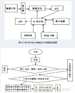 總體結(jié)構(gòu)設(shè)計。半導(dǎo)體敏元件、放大器、轉(zhuǎn)換開關(guān)、雙積分A/D轉(zhuǎn)換器、單片機(jī)、接口電路、IEEE~488標(biāo)準(zhǔn)接口、存儲器以及部分外圍電路組合在一起形成了智能壓力傳感器。
