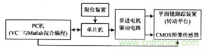 該系統(tǒng)主要由平面鏡跟蹤裝置、控制和驅(qū)動電路、方位限位電路、CMOS圖像傳感器(附巴德膜濾波片)等部分組成。系統(tǒng)總體設(shè)計框圖如圖1所示。跟蹤裝置實物圖如圖2所示,圖像傳感器固定在平面鏡中心。圖像傳感器產(chǎn)品主要分為CCD,CMOS以及CIS傳感器三種。目前CMOS型不僅價格低廉,而且已經(jīng)實現(xiàn)數(shù)字化輸出,軟件可編程控制,大大降低系統(tǒng)設(shè)計的難度,提高系統(tǒng)設(shè)計的靈活性、抗干擾性和穩(wěn)定性。