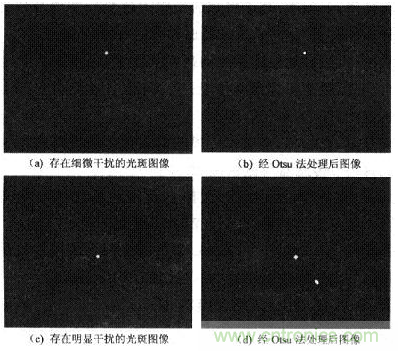圖4為拍攝到太陽光斑存在干擾時的圖像,對比圖4(a)和圖4(b)可發(fā)現(xiàn)用Otsu法分割處理后,能有效消除圖像中細微干擾。圖4(c)由Otsu法處理后得到圖4(d),光斑圖像坐標(160,120),光斑個數(shù)為2,對應(yīng)FYP和FWP為O。由此判斷拍攝的圖像存在明顯干擾,程序?qū)YP和FWP置為O,確保系統(tǒng)的可靠性。