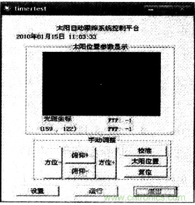 上位機可執(zhí)行程序控制界面如圖5所示,上位機控制平臺具有實現(xiàn)復(fù)位,太陽位置的跟蹤、手動校準。其中“設(shè)置”按鈕,可進行波特率、調(diào)整時間間隔等的設(shè)置。