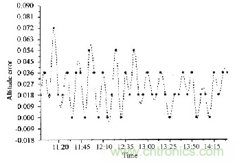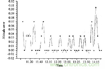 圖6和圖7給出了太陽高度角和方位角的誤差曲線。由曲線看出,采用基于圖像傳感器的太陽自動跟蹤控制器后絕對誤差較小且保持相對穩(wěn)定。通過對實測數(shù)據(jù)的分析表明:在該系統(tǒng)中,高度角跟蹤絕對誤差小于0.12°,方位角跟蹤絕對誤差小于0.08°,采用圖像傳感器對太陽進行跟蹤后,得到了很高的精度,且可靠性提高。