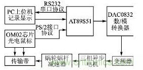 本系統(tǒng)采用全閉環(huán)控制方式,如下圖圖2,將鼠標(biāo)檢測到位移增量反饋回單片機(jī),并進(jìn)行數(shù)字式PID控制,運(yùn)算結(jié)果通過D/A轉(zhuǎn)換芯片傳給變頻器,從而控制電機(jī)的轉(zhuǎn)速。