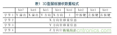 按照鼠標(biāo)的PS/2協(xié)議規(guī)范,實際編程時先對鼠標(biāo)發(fā)送0xff使其復(fù)位,默認(rèn)采樣頻率為100次/秒,縮放比例1:1,數(shù)據(jù)報告禁止。使用0xea命令進(jìn)入stream模式、使用0xe8,0x03命令設(shè)置解析度為8點/毫米。使用0xf4命令使能數(shù)據(jù)報告。配合AT89S51單片機(jī)的定時器功能,將其時間常數(shù)設(shè)置為0.1s,每次中斷時發(fā)送0xeb命令讀取位移數(shù)據(jù)信息,每發(fā)出一次,單片機(jī)接收到的位移數(shù)據(jù)包都包含有位移信息和按鍵動作信息。具體格式為表1所示。編譯時也只需提取X3的有效數(shù)據(jù)包即Y方向位移增量