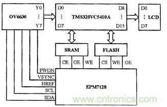 系統(tǒng)中的核心處理芯片選用TI公司的加強型定點DSP芯片TMS320VC5410A,該DSP的工作頻率可達160 MHz,內部有64KBRAM空間可以靈活的映射為數(shù)據(jù)或程序存儲空間。由于DSP的內部存儲空間有限,所以,本設計在外部擴展了一大小為1 MB的SRAM數(shù)據(jù)存儲器CY7C1021和256 K的FLASH程序存儲器SST39VF400A??刂菩酒珻PLD選用Altera公司的MAX7000系列芯片EPM7128SLC84-15。該芯片包含84個I/O管腳、128個宏單元,每16個宏單元可組成一個邏輯陣列塊,工作電壓為5.0 V。該芯片在系統(tǒng)中處于總體時序控制地位,既用于給圖像傳感器芯片提供控制信號。也用于SRAM和FLASH的片選和讀寫控制,同時還負責LCD的顯示控制。