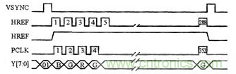 圖2中,每一個幀同步信號VSYNC周期包含288個水平同步信號HREF脈沖,而每一個HREF周期包含352個PCLK時鐘脈沖,每一個PCLK時鐘可輸出一個RGB像素的視頻數(shù)據(jù)。