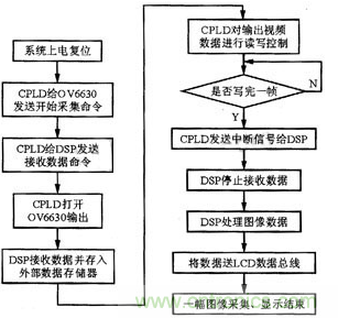 由于圖像像素點的個數(shù)已知,即數(shù)據(jù)個數(shù)已知,故在計數(shù)完畢后,CPLD將發(fā)出計數(shù)完畢信號。而DSP在接收到中止信號后,即可開始讀取RAM中的數(shù)據(jù),并對數(shù)據(jù)進行壓縮和相應的處理,然后把數(shù)據(jù)放到LCD液晶屏的數(shù)據(jù)總線,最后將采集到的圖像在液晶屏上顯示出來。圖3為圖像采集系統(tǒng)的軟件流程圖。