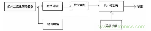 檢測電路由紅外二氧化碳傳感器、數(shù)字濾波電路、放大電路、穩(wěn)流電路、單片機系統(tǒng)、溫度補償?shù)冉M成?;驹硎羌t外二氧化碳傳感器將檢測到的二氧化碳氣體濃度轉(zhuǎn)換成相應(yīng)的電信號,輸出的電信號分別經(jīng)過濾波、放大處理,輸入到單片機系統(tǒng),并經(jīng)溫度和氣壓補償?shù)忍幚砗?,由單片機系統(tǒng)輸出送顯示裝置顯示其測量值。