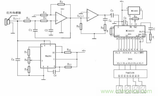 按照上述設(shè)計原理,設(shè)計的二氧化碳檢測電路如圖3所示。工作原理是首先由紅外傳感器將探測到二氧化碳氣體的濃度并轉(zhuǎn)換成電信號,濾波電路提取電信號并輸出到放大電路,經(jīng)過單片機系統(tǒng)處理后輸出,再由74AC138送入顯示電路,以實現(xiàn)對二氧化碳氣體濃度的檢測。
