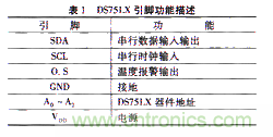 DS75LX工作電壓為1.7 V到3.7 V。除了基本的測溫功能外,DS75LX還具有溫度報警功能,允許用戶通過軟件設置報警溫度的門限值。DS75LX測溫范圍為-55℃~+125℃,當測溫范圍為-25℃~+100℃時,測量精度為±2℃。DS75LX同時具有可編程的9至12位的溫度數據輸出格式。輸出的溫度數據為12位時,其分辨率可達0.0625℃。該傳感器具有三個地址引腳,可設置為三種狀態(tài)中的任意一種:接GND、VDD,或懸空,可設置27種地址組合。例如A2、A1和A0分別為接電源、接地和懸空時,DS75LX的器件地址為0101110。圖1是DS75LX的引腳排列,各功能描述如表1所示。