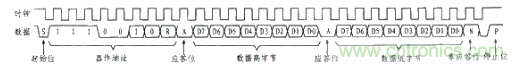 DX75LX的讀寫操作是通過兩線串行總線接口實現(xiàn)的,該串行總線與I2C總線兼容。圖2所示為讀溫度及溫度門限寄存器的時序圖。此時假定寄存器指針已指向溫度寄存器,否則需要對指針進行設置。設置方法如下:主器件產生起始位、發(fā)送包含DS75LX地址的寫命令、收到應答、發(fā)送寄存器指針字節(jié)。注意只有指針字節(jié)的低兩位(P1、P0位)有效。