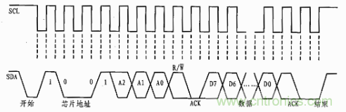 AD7416采用I2C串行總線和數(shù)據(jù)傳輸協(xié)議來(lái)實(shí)現(xiàn)同外設(shè)的數(shù)據(jù)傳輸。在數(shù)據(jù)傳輸過(guò)程中AD7416作為從器件通過(guò)數(shù)據(jù)輸入/輸出線SDA以及時(shí)鐘信號(hào)線SCL與總線相連。其傳輸時(shí)序如圖3所示。當(dāng)SCL保持高電平時(shí),SDA從高電平到低電平的跳變?yōu)閿?shù)據(jù)傳輸?shù)拈_(kāi)始信號(hào),隨后傳送AD7416的地址信息的讀/寫(xiě)控制位。其地址信息的格式為:100A2A1A0R/W。