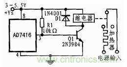 這些默認(rèn)值可使該溫度傳感器在不連接串行總線時(shí)用作自動(dòng)調(diào)溫器,圖4所示就是AD7416作為自動(dòng)調(diào)溫器的典型應(yīng)用電路原理圖。當(dāng)被測(cè)量的環(huán)境溫度低于 THYST時(shí),OTI輸出高電平,Q1導(dǎo)通,繼電器吸合,加熱器開(kāi)始工作;當(dāng)被測(cè)量的環(huán)境溫度高于TOTI時(shí),OTI輸出低電平,將Q1的基極電位拉低以使其截止,繼電器釋放,加熱器停止工作。