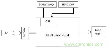 本系統(tǒng)的硬件結(jié)構(gòu)如圖2所示。由于At91sam7s64具有片上A/D轉(zhuǎn)換器而且具有8選1模擬復(fù)用器,使得MMA7620Q和HMC2003可以直接與微控制器相連而不必外加A/D轉(zhuǎn)換器和復(fù)用器,不僅降低了系統(tǒng)的成本和體積,提高了系統(tǒng)的集成度,同時(shí)減少了誤差源,提高了精度。經(jīng)過A/D轉(zhuǎn)換的測(cè)量數(shù)據(jù)經(jīng)過ARM核的處理后,被送到串口LCD并通過RS232接口送入PC機(jī)進(jìn)行進(jìn)一步的分析。