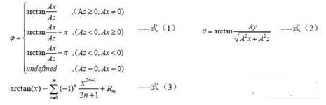 為了獲得系統(tǒng)基于重力向量的俯仰角θ和橫滾角φ,需要使用加速度計(jì)的三個(gè)輸出:Ax, Ay, Az.俯仰角和橫滾角可以通過以下公式(1)和公式(2)計(jì)算得到。對(duì)于微控制器,函數(shù)中的arctan(x)需要通過以下公式(3)的泰勒展開后才能計(jì)算得到。