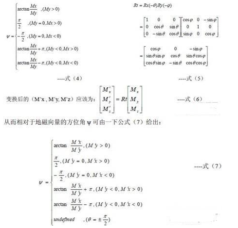 為了獲得系統(tǒng)相對(duì)于當(dāng)?shù)氐卮畔蛄康姆轿唤?,需要使用MR傳感器的三個(gè)輸出Mx, My, Mz.當(dāng)系統(tǒng)置于水平狀態(tài)時(shí)(俯仰角和橫滾角都為0)時(shí),方位角ψ可以由公式(4)直接給出,但是在大多數(shù)情況下,系統(tǒng)并不是工作在水平狀態(tài),此時(shí)地磁場(chǎng)的豎直分量將會(huì)影響Mx和My的值,因此不能直接由公式(4)獲得相對(duì)于地磁向量的方位角。為了在所有情況下都能獲得正確的方位角,必須將俯仰角和橫滾角考慮在內(nèi),即必須通過以俯仰角和橫滾角為參數(shù)的坐標(biāo)變換,將測(cè)得的(Mx, My, Mz)向量變換為與載體坐標(biāo)系有相同方位角的水平坐標(biāo)系下的向量(M‘x , M’y, M‘z),其變換矩陣如公式(5)。