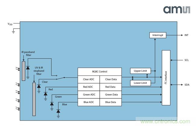 除了傳統(tǒng)的紅、綠、藍(RGB)顏色傳感通道,該傳感器中還特別包含了紅外線測量通道,能可靠地感測到環(huán)境光源中的紅外線。無論是在室內還是室外,數碼相機和智能手機都能通過調整閃光燈的色溫拍出更好的照片。顏色測量會受到光線中紅外線變化的影響,因而傳感器中包含了一個參考(C)光電二極管,提供直接測量的參考數據,以幫助精確地扣除不需要的殘余紅外線能量。此外,RGBC光電二極管集成了紅外濾波器,可將紅外線光譜成分的影響降到最低,進一步提高顏色測量的準確性。