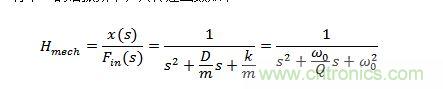 其中Fin(s)是輸入的力(在使用陀螺儀時(shí)是科里奧利力,在使用加速度計(jì)時(shí)是由于輸入加速產(chǎn)生的力)。x(s)是傳感器質(zhì)量塊對(duì)應(yīng)輸入力的位移。m是質(zhì)量塊的質(zhì)量,D是阻尼系數(shù),k是彈簧常數(shù)(剛度)。