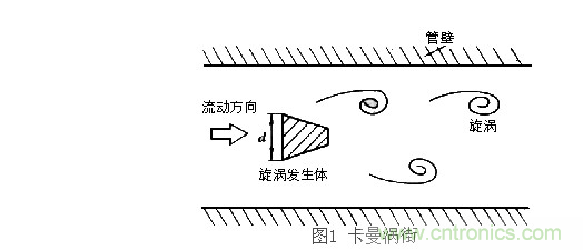 根據(jù)卡曼渦街理論(見圖一),在無限界流場(chǎng)中垂直插入一根無限長的非線性阻力體(即旋渦發(fā)生體C,風(fēng)速傳感器的探頭橫桿),當(dāng)風(fēng)流流經(jīng)旋渦發(fā)生體C時(shí),在漩渦發(fā)生體邊緣下游側(cè)會(huì)產(chǎn)生兩排交替的、內(nèi)旋的旋渦列(即氣流旋渦),而旋渦的產(chǎn)生頻率f正比于流速V,用公式表示如下: