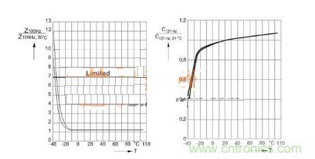 在鋁電解高壓電容器的正常運(yùn)行過程中,其本身的電解液導(dǎo)電性,將會隨著環(huán)境溫度的降低而降低,從而會導(dǎo)致電解液阻抗的增加,阻抗和損耗角正切也會因此而增大。在絕大多數(shù)應(yīng)用中,相應(yīng)增加僅允許到某最大值。在這里需要強(qiáng)調(diào)的一點(diǎn)是,低于上述溫度限值的工作并不會損壞高壓電容,僅僅只是會影響其使用壽命,尤其是當(dāng)紋波電流流經(jīng)器件時(shí),由于增加ESR而產(chǎn)生的熱量耗散會提高電容器溫度,使其遠(yuǎn)大于環(huán)境溫度,使電容可維持設(shè)備運(yùn)行。下圖所示為下限類別溫度為-25℃電容器的阻抗和電容典型值。