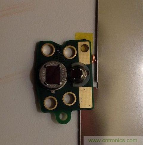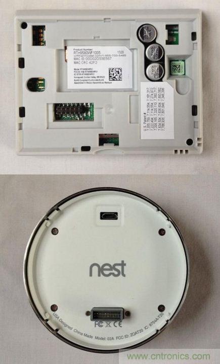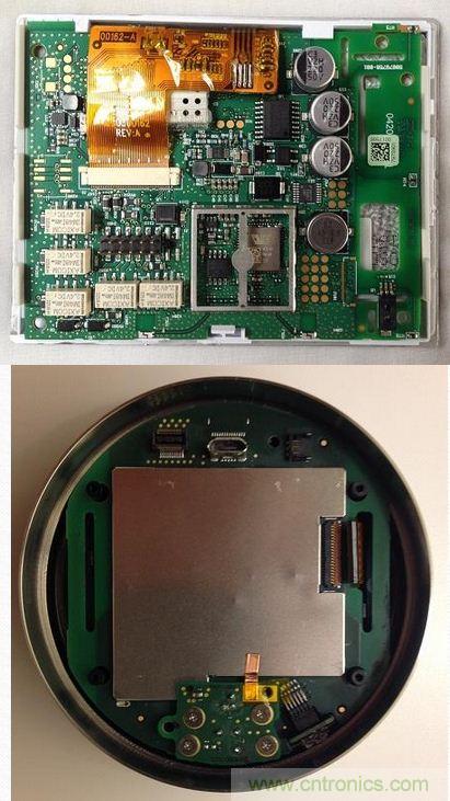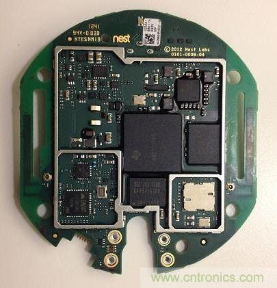 霍尼韋爾恒溫器的單個PCB上包括多個DC-DC轉(zhuǎn)換器、穩(wěn)壓器和整流器、一個8通道12位ADC、128MB SDRAM、32M閃存和博通(Broadcom)Wi-Fi模塊(屏蔽罩移除)。主處理器是愛特梅爾(Atmel)926 ARM處理器,外面包覆了金屬屏蔽罩,僅在扁平帶狀電纜至顯示器下方可見。Nest恒溫器的主要電子元器件全部被包覆在單個屏蔽罩下??拷撞康膬蓚€附加電路提供檢測功能。PCB與顯示器通過螺絲固定,金屬環(huán)被卡在兩者之間,但可以自由旋轉(zhuǎn)。