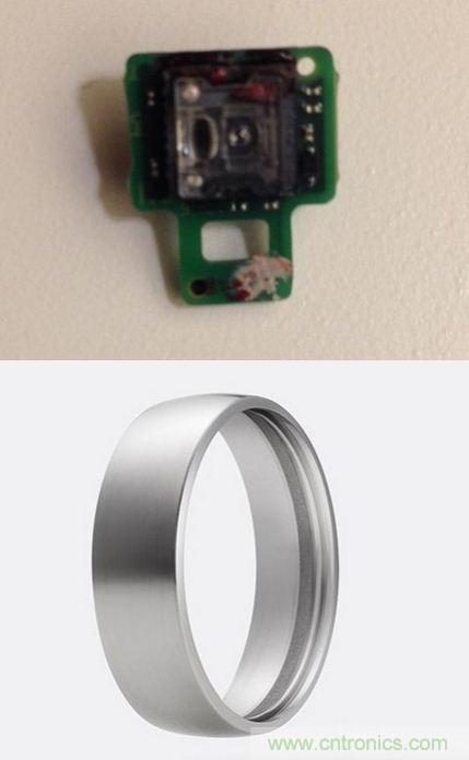 用戶可以旋轉(zhuǎn)Nest恒溫器的外圈來選擇選項。這個光電鼠標上的發(fā)射器/傳感器組合就是用來檢測旋轉(zhuǎn)的器件。外圈內(nèi)部可以看到光學鼠標元件用來檢測旋轉(zhuǎn)的溝槽圖案。