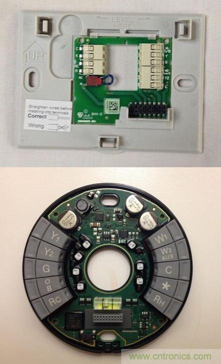 霍尼韋爾恒溫器的入墻式插座是一塊簡單的、帶有暖通空調(diào)(HVAC)單元線纜連接器的雙層PCB。Nest恒溫器的入墻式插座帶有有源器件,包括一個意法半導體(STMicro)STM32L151微控制器和一個8通道模擬多路開關(guān)。插座板中間的氣泡水準器用于協(xié)助將背板合適地安裝在墻上。