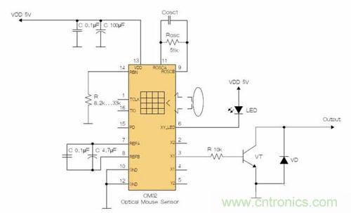 鼠標芯片的CMOS光學傳感器可提供非機械式跟蹤引擎。在該芯片內部可完成圖像的捕獲、數(shù)字化和數(shù)字處理。就拿簡單且低成本的OM02來說,該傳感器通過采集表面圖像幀來測量位置,并通過數(shù)學運算判定運動方向和距離。該傳感器安裝聚苯乙烯光學封裝中,設計用來與高亮度LED一起使用。它有一個完整且緊湊的跟蹤引擎;沒有活動部件,也不要求精密的光學對準。OM02可以為X和Y方向運動產生正交輸出信號。分辨率約為0.0025英寸,運動速度最高為每秒16英寸。