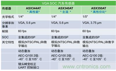 ASX344/340/350AT是用于倒車影像的系統(tǒng)級芯片(SoC),在單芯片上集成圖像信號處理器,增強的像素性能提供微光條件下的更高能見度,支持高達4層的圖像疊加以向顯示系統(tǒng)提供更多的倒車信息,支持數(shù)字縮放和平移,并附加光學(xué)中心點矯正功能,這可為客戶提供相機組裝生產(chǎn)后鏡頭中心點矯正功能,從而節(jié)省成本。這三款圖像傳感器都完全通過AEC-Q100認證,并具備-40°C至105°C的寬工作溫度范圍,它們的不同之處在于:ASX344AT還集成魚眼畸變校正功能和提供UART控制接口,定位為“高性能”的方案;ASX350AT的光學(xué)格式為1/5英寸,不同于ASX344/340AT的1/4英寸,定位為“高性價比”的方案;而ASX340AT定位為“主流”方案。設(shè)計人員可根據(jù)目標客戶的具體需求選擇有針對性的方案。