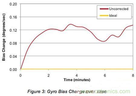 圖7:隨時間改變的陀螺儀零偏,包括校正和未校正的情況。