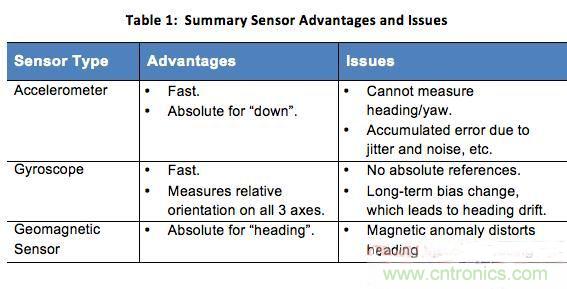 如前所述,加速度計、陀螺儀和地磁傳感器每個都有各自的優(yōu)缺點。下表1總結了每種傳感器在運動跟蹤方面的主要優(yōu)勢和問題。