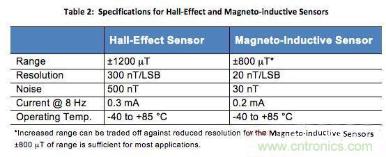 在今天的消費電子產(chǎn)品中使用最廣泛的地磁傳感器是霍爾效應傳感器。這種傳感器主導消費市場的原因是體積小、價格低并且節(jié)省功耗。但這種傳感器同樣有噪聲,很容易受其它磁場干擾,這些問題如果不校正將限制其向陀螺儀提供正確航向數(shù)據(jù)的能力。然而,如果能夠接受稍大尺寸的永磁感應式地磁傳感器,就可以在不犧牲成本或功耗的情況下獲得顯著改進的噪聲與分辨率性能。表2顯示了霍爾效應和永磁感應傳感器的規(guī)格。注意,永磁感應傳感器可以提供明顯更低的噪聲和更高的分辨率。