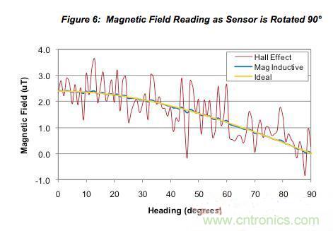 下圖顯示了地磁傳感器在磁場強度為2.4mT數(shù)量級的固定位置旋轉(zhuǎn)時輸出的磁場讀數(shù)。在圖5中,傳感器旋轉(zhuǎn)了整整360°,而在圖6中,傳感器從0°旋轉(zhuǎn)到90°。這兩張圖都繪出了霍爾效應傳感器、永磁感應傳感器和理想傳感器的試驗數(shù)據(jù)。