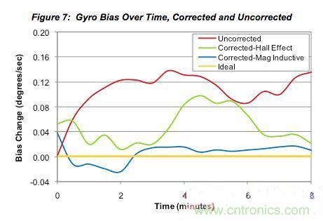 前面的圖3給出了隨時間變化的陀螺儀零偏,它代表了長期航向漂移的根本原因。在9軸傳感器融合系統(tǒng)中,加速度計和磁力傳感器建立了一個長期的基準用于校正零偏變化。但磁力傳感器讀數(shù)中的噪聲以及磁力傳感器類型對零偏校正的效果有顯著的影響。圖7再次顯示了隨時間改變的零偏變化,但這次畫出了未校正的、用霍爾效應傳感器校正的、用永磁感應傳感器校正的和理想輸出的圖形。值得注意的是,所用的傳感器融合算法對兩種傳感器來說是相同的。