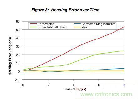 永磁感應傳感器可以更好地控制零偏漂移的能力將顯著改善隨時間變化的航向性能,如圖8所示。我們在這里可以看到,與未校正系統(tǒng)相比,使用霍爾效應傳感器的傳感器融合系統(tǒng)的長期性能在8分鐘內(nèi)減少航向誤差的效果高出2倍。但使用永磁感應傳感器的傳感器融合系統(tǒng)與未校正系統(tǒng)相比可以減少航向誤差一個數(shù)量級,比基于霍爾效應磁力傳感器的系統(tǒng)好5倍。