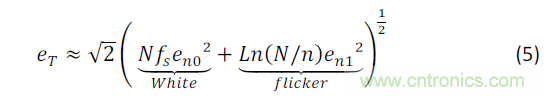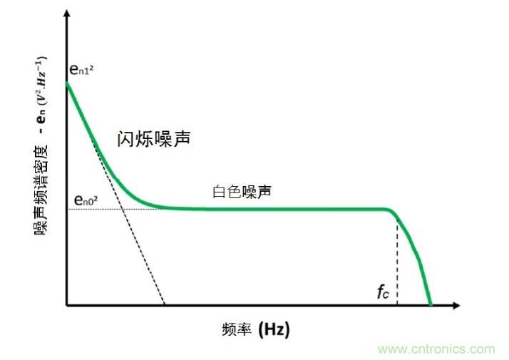 噪聲最由兩個(gè)因素造成:1/f閃爍噪聲和熱噪聲(見(jiàn)圖2)。閃爍噪聲是大自然中常有的噪聲,而它旳頻譜密度和地球自轉(zhuǎn)速度、海底水流、天氣以至氣候現(xiàn)象等活動(dòng)相關(guān)。研究報(bào)告顯示普通蠟燭的閃爍速率是1/f 。在MOS器件和放大鏈各元素中,閃爍噪聲則是技術(shù)工藝誤差生成的缺陷,使電荷被困于柵極氧化物內(nèi)所造成的結(jié)果。電荷進(jìn)出這些“陷阱”,造成晶體管通道內(nèi)的電流不穩(wěn)定 [6],故又稱「隨機(jī)電報(bào)噪聲」(random telegraph noise,RTS)。利用洛倫茲數(shù)學(xué)模型(Lorentzian mathematical model) 可以形容每一個(gè)“陷阱”的共振行為,而模型的總和(即MOSFET通道表面范圍的所有“陷阱”總和)在1/f頻譜上展示時(shí),會(huì)全完符合具體噪聲的頻譜密度。結(jié)果顯示,1/f波幅與MOSFET通道表面面積成反比──而不是完全直觀。