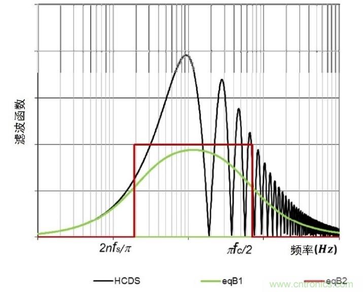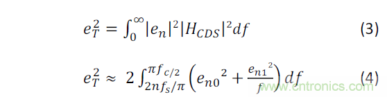 在算式中,fs 是采樣頻率, n是CDS 因子(通常n=2)。如圖3顯示,取決于采樣頻率,這一濾波或多或少地去除1/f噪聲頻率成分,尤其是當(dāng)采樣頻率fs很高的時(shí)候 顯著(換句話說(shuō),電荷進(jìn)出“陷阱”的動(dòng)作將慢于CDS頻率)。HCDS濾波器結(jié)合放大鏈的低通濾波器可以簡(jiǎn)化為一個(gè)如圖3所示的等效帶通濾波器。圖中的eqBP1 對(duì)應(yīng)一個(gè)一級(jí)帶通濾波器。這裡eqBP1的噪聲頻譜函數(shù)要除以2,以得到一個(gè)帶有HCDS函數(shù)的等效集成噪聲功率 。eqBP2 是eqBP1的陷波估算值。要取得集成噪聲功率,eqBP2 的上限和下限分別按照下列算式進(jìn)行倍增: