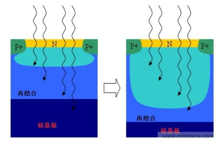 因?yàn)檫@個(gè)原因,ITCCD不能從BSI中獲益。而高端CCD因?yàn)槭褂么怪笨箷灩に?,所以沒(méi)有這一限制。而CMOS也具有同一特點(diǎn):在薄的感測(cè)層上,因?yàn)殡姾刹粫?huì)在像素之間滲透,所以沒(méi)有串?dāng)_的缺點(diǎn)。結(jié)果是ITCCD和標(biāo)準(zhǔn)CIS都能夠?qū)崿F(xiàn)良好的空域解析度或調(diào)制轉(zhuǎn)換函數(shù)(modulated transfer function,MTF) 。要增加NIR部份和敏感度,需要顯著增加物料厚度,但是厚物料會(huì)增加光電串?dāng)_,引致MTF衰減。成像質(zhì)量是MTF和QE的綜合結(jié)果(即所謂的檢測(cè)量子效率Detective Quantum Efficiency,DQE),所以必需同時(shí)考量空域和時(shí)域因素。圖6顯示利用硅摻雜方法恢復(fù)MTF的深耗盡(deep depletion)光電二極管。一般來(lái)說(shuō),CIS使用類似集成電路的常用技術(shù)(特別是DRAM/內(nèi)存工藝)生產(chǎn),所以不會(huì)牽涉上述的特定工藝配方。不過(guò)近期的技術(shù)研究文章展示適用于CIS的特定工藝導(dǎo)入方案,能實(shí)現(xiàn)出色的QE改進(jìn)甚至相對(duì)接近高端CCD的水平(見(jiàn)圖5)。最新的CMOS技術(shù)趨勢(shì)可說(shuō)是突飛猛進(jìn),引進(jìn)了如導(dǎo)光板、深槽隔離(deep trench isolation,DTI)、埋藏微透鏡,以及在光敏范圍下嵌入包含像素晶體管的迭層芯片等技術(shù)。