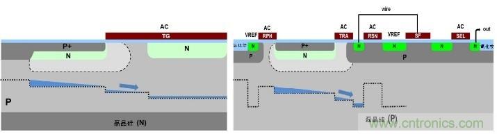 “嵌入式光電二極管” (pinned photodiode,PPD) 或“空穴堆積二極管”(hole accumulation diode,HAD) 最初開(kāi)發(fā)目的是消除延遲并把全部電荷從光電二極管轉(zhuǎn)移到ITCCD寄存器[12]。CMOS圖像傳感器的一個(gè)重大發(fā)展是在2000年代初期引進(jìn)ITCCD光電二極管結(jié)構(gòu)[11],如圖7所示。在CMOS中,像素結(jié)構(gòu)多數(shù)以每像素的晶體管數(shù)目來(lái)表示。大部分 CMOS圖像傳感器傾向使用電子卷簾快門(mén)(electronic rolling shutter),這有助于集成并只需少至三個(gè)晶體管 (3T)就能實(shí)現(xiàn)。雖然有結(jié)構(gòu)簡(jiǎn)單的優(yōu)點(diǎn),3T像素結(jié)構(gòu)的缺點(diǎn)是電路來(lái)自kT/C (或溫度) 噪聲的像素生成時(shí)域噪聲會(huì)較大,而且不能輕易消除。