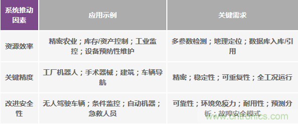 工業(yè)機械和流程最具價值的進步集中在有形的系統(tǒng)級優(yōu)勢上,而這通常會帶來設計和實現(xiàn)方面的挑戰(zhàn),這些挑戰(zhàn)又會發(fā)展成新的問題解決方案和業(yè)務模式。這種系統(tǒng)級推動因素可以歸納為三項追求,即對資源效率、關(guān)鍵精度和更高安全性的追求。瞄準這些橫跨多個行業(yè)的改進的應用,包括跨越空中/地面/海上、室內(nèi)/室外、短期/長期和人/機等,但無論如何,它們都依賴于共同的屬性;即精度、可靠性、安全性和智能處理與分析,如表1所示。