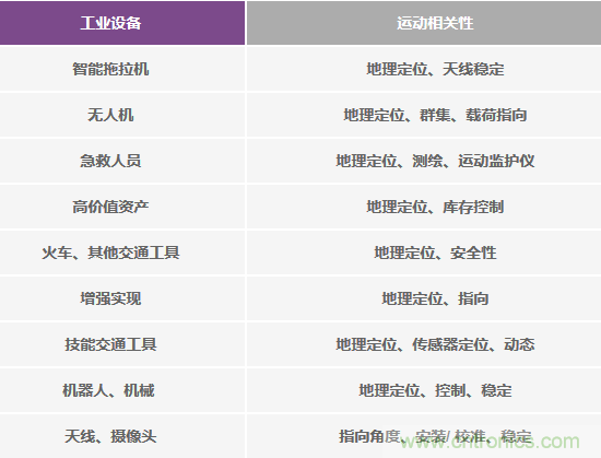 多數(shù)情況下,物聯(lián)網(wǎng)都處于運動狀態(tài)。即使不處于運動狀態(tài)——比如,靜止的工業(yè)安全攝像頭——精密指向仍可能必不可少,或者,關(guān)于無用運動(篡改)的知識也可能非常有價值。如果能在惡劣的飛行條件下維持精確的指向角度,用光學載荷捕捉作物圖像的無人機就有可能更快地帶來更好的結(jié)果;如果能為光學數(shù)據(jù)提供準確的地理測繪信息,則有可能實現(xiàn)對數(shù)據(jù)和趨勢的歷史比較。智能交通工具,無論是地面交通工具,還是空中或海上交通工具,它們都越來越依賴GPS導航。然而,GPS遭受的精度壓力也越來越大,無論是有意為之,還是自然使然(建筑物、樹木、隧道等)。如果選擇時考慮了精度需求,則額外的傳感器仍然可以在事故中斷期間可靠地進行航向角推算。表2列出了使IoMT(運動物聯(lián)網(wǎng))中的M(運動)概念名符其實的一些因素,注意運動與通用應用之間的關(guān)系。