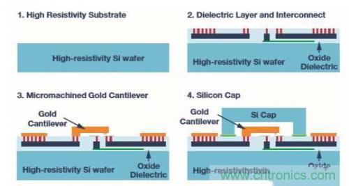 圖二中所示為利用MEMS技術(shù)制造開關(guān)的四個(gè)主要步驟。 該開關(guān)是以高電阻率的硅芯片(具有沈積在頂部的厚電介質(zhì)層以提供與下方基板的優(yōu)越電氣隔離)所建構(gòu)。 使用了標(biāo)準(zhǔn)的后端CMOS內(nèi)部鏈接制程實(shí)現(xiàn)與MEMS開關(guān)的內(nèi)部鏈接。 低電阻率金屬與多晶硅都被用來(lái)制作與MEMS開關(guān)的電氣鏈接,而且都被嵌入至電介質(zhì)層當(dāng)中。