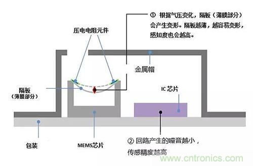 在封裝內(nèi)部,裝有懸掛在真空環(huán)境中的硅薄膜(隔膜),檢測(cè)外部空氣進(jìn)入隔膜后所產(chǎn)生的氣壓變化。為了提高傳感器的檢測(cè)精度,硅膜片必須做到盡可能薄,以便在感觸細(xì)微的氣壓后可以產(chǎn)生巨大的變形。
